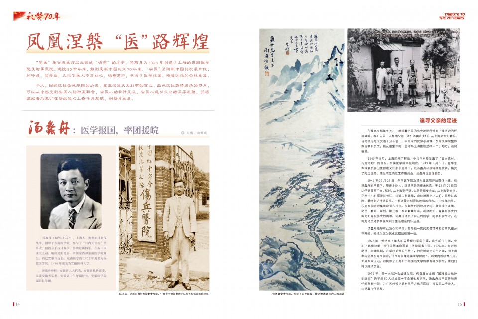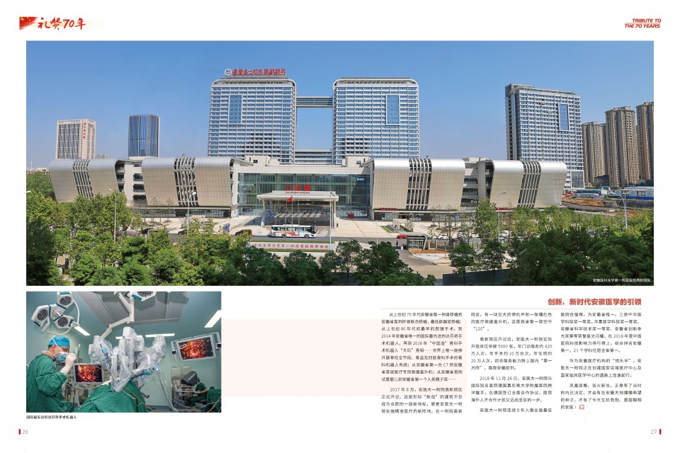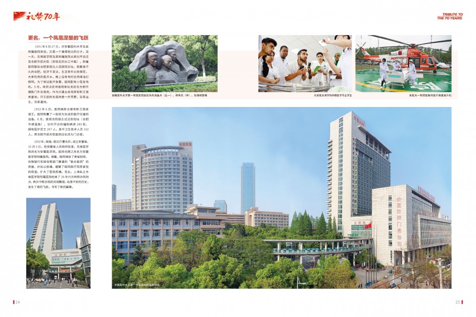 编者按:为庆祝新中国成立70周年暨医院内迁70周年,医院与安徽画报社联合推出14个整版的系列报道。回顾医院建院以来,特别是内迁安徽70年来赤诚报国的历史,重温一段从无到有的变迁,品味这段激情燃烧的岁月,从中感受到安医人的神圣职责,安医人的精神风采,安医人建功立业的深厚底蕴,并将激励着后辈们在新的起点上奋斗再启航,创新再发展。