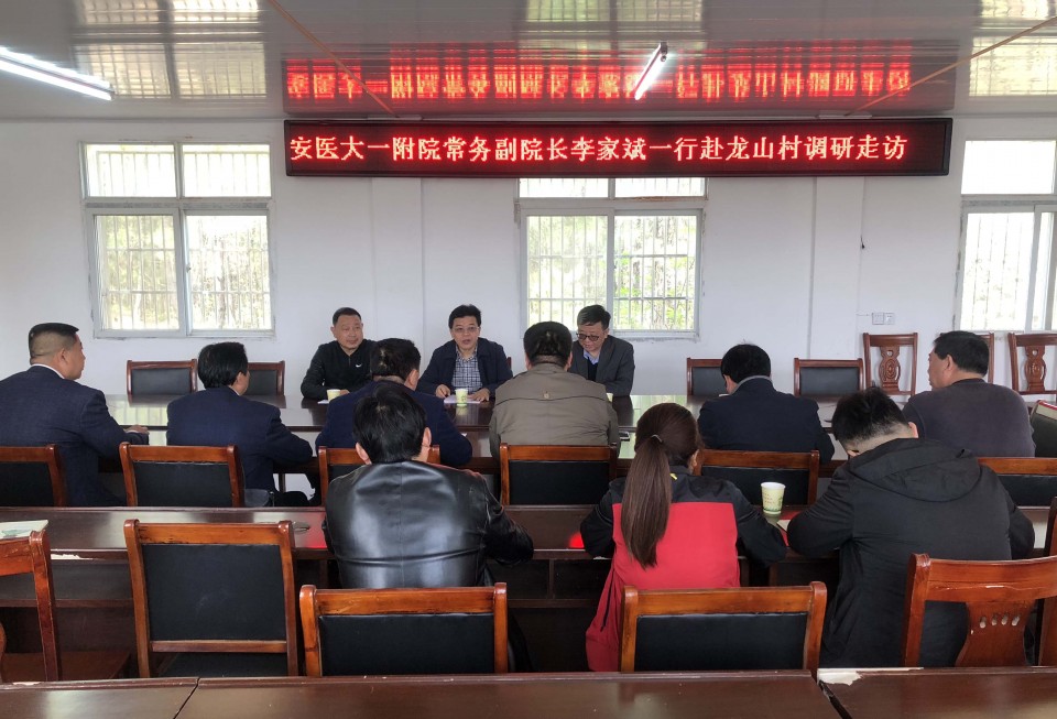 4月12日,常务副院长李家斌一行来到医院定点帮扶村太湖县江塘乡龙山村,听取扶贫工作汇报,实地查看医院捐资兴建的扶贫产业基地和龙山村规划建设的田园综合体项目。太湖县委常委、副县长刘存磊和江塘乡党委书记王丙宇等陪同调研,院门急诊党总支书记李维荣、医患沟通中心主任张国华随行慰问结对帮扶的贫困户。在龙山村扶贫调研会上,李家斌认真听取了扶贫工作队队的帮扶工作汇报,向村两委负责同志仔细了解了龙山村脱贫攻坚的进展情况和当前发展中面临的紧迫困难,与江塘乡党委主要负责同志详细交流了医院帮扶的产业基地的帮扶成效及利益分红等问题。他指出,贫困村的稳定脱贫一定要建立在形成可持续发展的产业之上,才能切实有效地保障贫困群众在顺利脱贫后,进一步走向致富。会后,李家斌一行实地查看了医院捐资兴建的村扶贫产业基地,对医院继续采购、引入龙山村农副产品给予了积极回应。他还对龙山村利用环潘岭水库沿线打造经济果林、农家乐、休闲垂钓等田园综合体项目进行了指导。