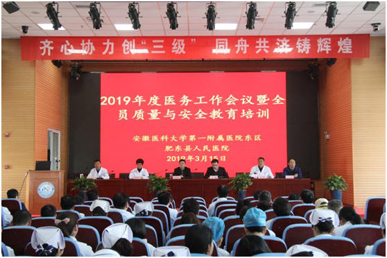 3月15日,我院东区举办了2019年度医务工作会议暨全员质量与安全教育培训会议,常务副院长李家斌等一行受邀出席开幕式,东区院领导班子及相关部门负责人参加了会议,会议由东区院长张勇主持。会上,东区院长张勇总结了2018年度各项医务相关工作,并就2019年度医务重点工作进行了布置。在听取了东区团队的工作汇报后,常务副院长李家斌对大家的工作表示了充分的肯定,并希望大家立足岗位、着眼长远,早日成功创建三级医院。