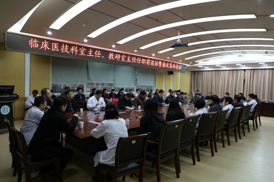 2月13日下午,医院在干部保健中心二楼会议室召开新任职临床医技科室主任、教研室主任任职前谈话暨廉政集体谈话。院党委书记金宗祥、院长梁朝朝、纪委书记陈宏凯、党委副书记戴晓支出席会议。新任职临床医技科室主任、教研室主任参加会议。会议由戴晓支副书记主持。