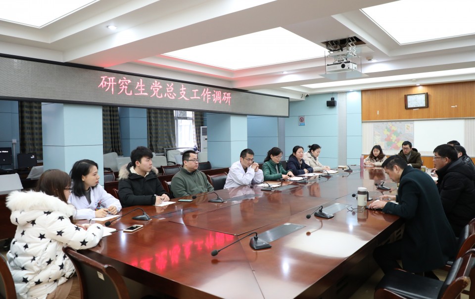 新年伊始,2月14日上午,党委书记金宗祥、纪委书记陈宏凯、党委副书记戴晓支和党委工作部部长丁长明一行赴研究生党总支调研党建工作,研究生党总支书记赵嘉芸及各支部书记、支委参加会议。赵嘉芸书记从研究生党总支党建工作开展情况、存在的薄弱环节以及2019年工作计划等方面进行详细汇报,各支部书记、委员也从支部建设、研究生和规培生管理等方面相继建言。