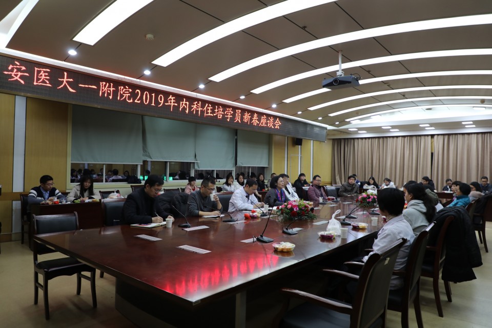 1月28日晚,2019年内科住培学员新春座谈会在干部保健中心楼二楼会议室召开,会议由内科基地主任帅宗文主持,王珩副院长出席,毕业后教育处处长田仰华、内科党支部书记章秋、内科基地教学主任张磊、呼吸内科主任孙耕耘、内科基地各科教学秘书及住培学员代表参会。