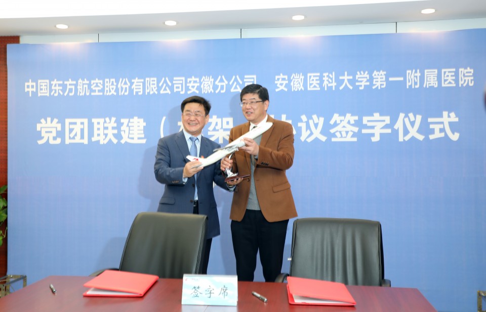 11月21日,我院与东航安徽分公司签署了党团联建(框架)协议。医院党委书记金宗祥、党委副书记戴晓支,东航安徽分公司党委书记段新军、副总经理陈小雄及双方各职能部门负责人、青年代表共计30余人出席本次签约仪式。仪式上,戴晓支代表医院与东航安徽分公司签署了党团联建(框架)协议,东航安徽分公司向金宗祥赠送了飞机模型作为纪念。