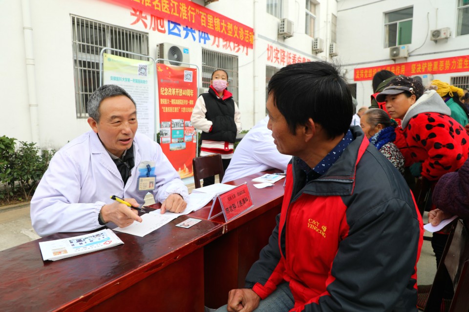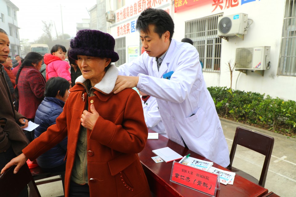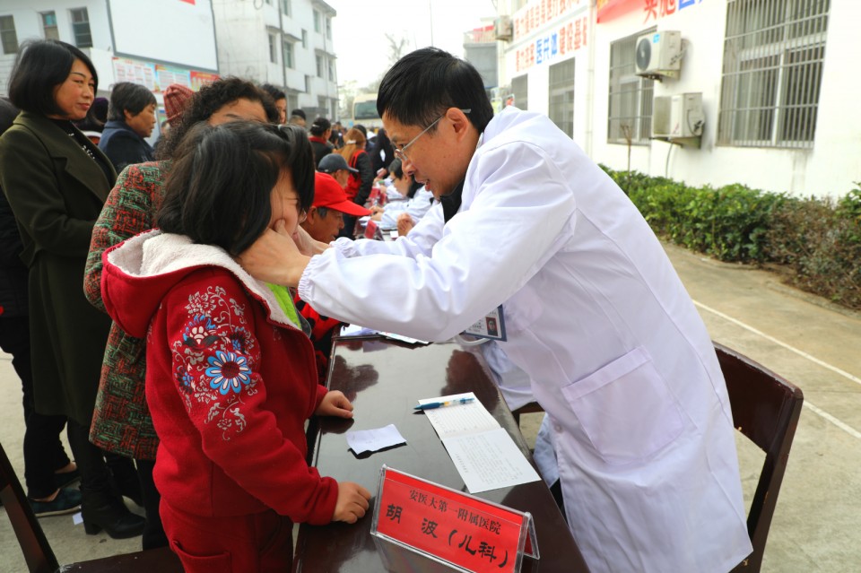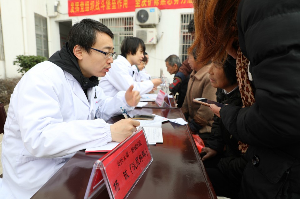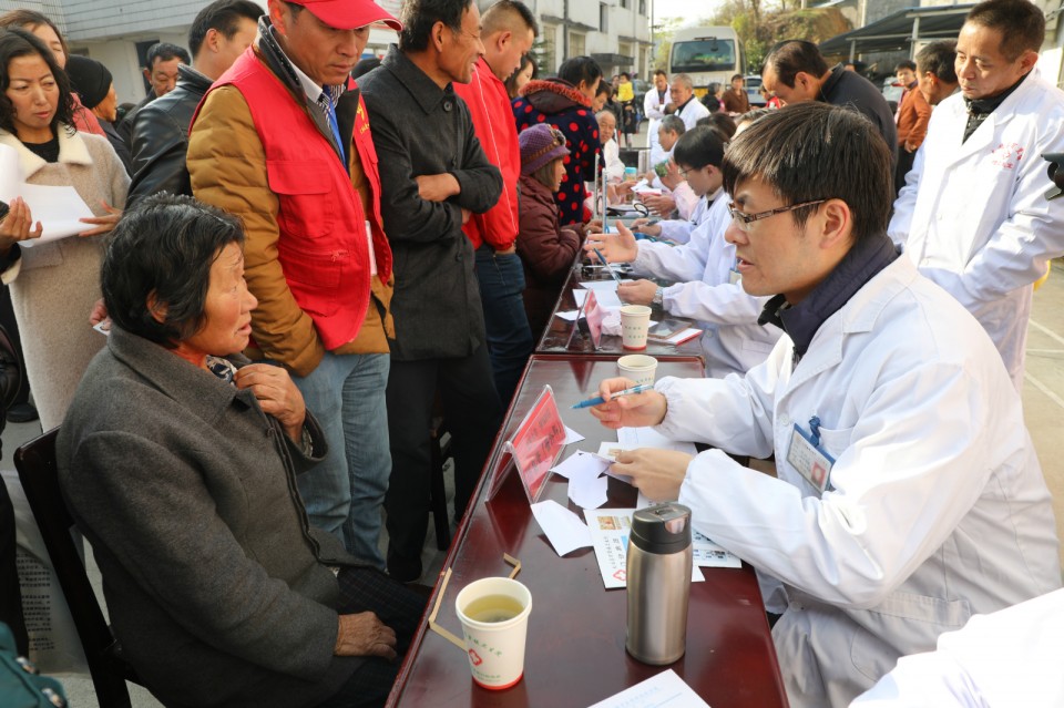 11月24日上午,医院开展庆祝改革开放40周年“江淮名医江淮行”暨青年卫生志愿者医疗队卫生帮扶太湖县百里镇大型义诊活动。院党委副书记戴晓支率5位“江淮名医”——儿科主任医师胡波、消化内科主任医师胡乃中、普胸外科主任医师于在诚、骨科主任医师汤健、疼痛科主任医师陈家骅及中共十九大代表、心脏大血管外科主任医师林敏、内分泌科主任医师何勇、移动心脏彩超检查专家金朝龙、心血管内科专家张益明等医学专家、第25期青年卫生志愿者为当地百姓送去健康服务。移动DR车和便携心脏彩超机全程技术支持。安徽日报摄影记者随队做了跟踪采访。太湖县委常委殷跃平、县卫计委主任王峰来到现场。