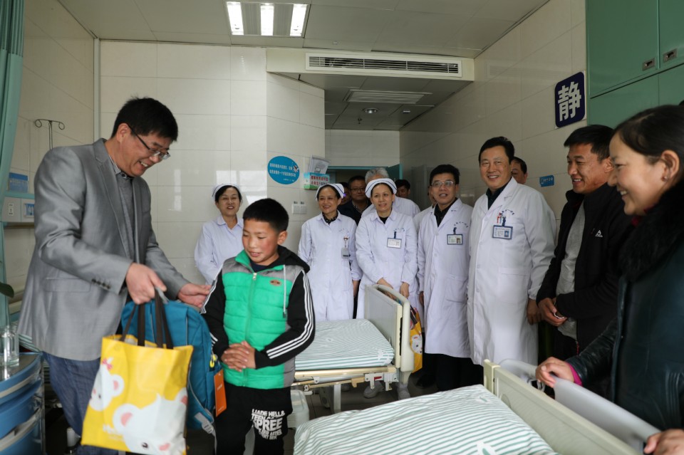 11月12日上午,院领导金宗祥、梁朝朝、李家斌来到心脏大血管外科病房,专程看望西藏山南地区来我院接受先天性心脏病手术治疗的孩子们,院领导走进病房时,孩子们正开心地和志愿者们交流互动。院领导与孩子们及家属亲切的交谈,了解他们住院期间的生活需求,询问他们是否适应,并给孩子们送上了书包、图书等,并指出,为了做好救治工作,医院安排了一支业务精干的团队专门负责,并要求相关部门要紧密配合,务必保障好救治的各项工作。