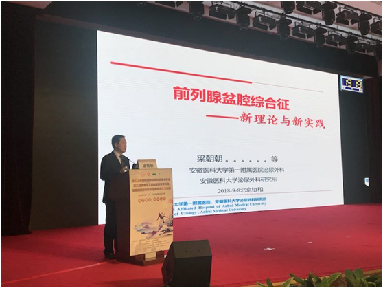 2018年9月8日,来自全国各地及海外的泌尿男科专家学者、医师们齐聚北京协和医院学术会堂。第五届中国医师协会男科学学术分会暨第二届世界华人男科医师学术大会在这里盛大召开,安医大一附院梁朝朝教授及其团队应邀参加此次盛会。 大会开幕式上,梁朝朝教授担任了大会首场专题报告的主持人,来自美国、意大利等世界顶级专家进行了学术报告。随后梁朝朝教授进行了《前列腺盆腔综合症:新理论新实践》的大会主旨报告,向与会同道介绍了该团队20多年的研究成果,提出了“前列腺盆腔综合症”这一新理论,改变了过去传统慢性前列腺炎的诊断标准,并提出了新的疗效评判标准及其诊疗方面的应用。演讲赢得了国内外众多嘉宾的多次热烈掌声,多位著名专家学者对梁朝朝教授研究团队在慢性前列腺炎研究方面的贡献给予高度评价和赞赏,并勉励继续深入研究,以获得更多的研究成果来指导临床工作。