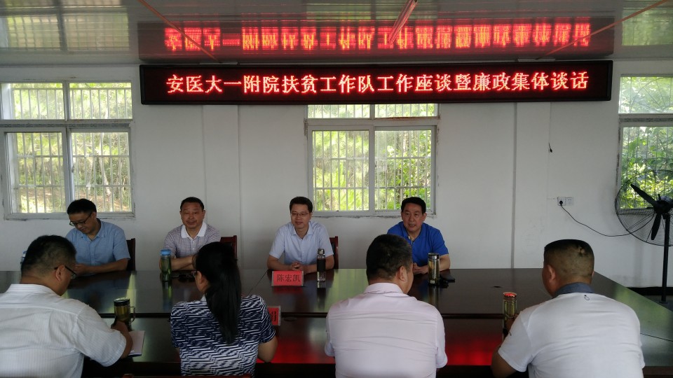 火红的八月,艳阳高照,酷暑难耐,8月4日,院纪委书记陈宏凯来到医院定点帮扶的龙山村,与扶贫工作队、村两委座谈脱贫攻坚工作,进行脱贫攻坚廉政集体谈话。陈宏凯首先来到村扶贫办公室查看扶贫资料和脱贫档案,随后深入了解医院自2017年以来帮扶该村的精准扶贫措施,认真听取扶贫工作情况汇报和医院帮扶资金的使用情况,实地查看了医院援建的光伏电站和扶贫产业景湖小黄鸡基地。