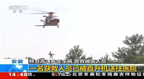 通过军民航申请批复后,空中120人第一时间从安医大一附院高新院区基地起飞飞往事故现场参与救援。于20分钟内到达救援现场。因现场条件不适合直升机起降,直升机通过绞车将救生员放至地面,进行后续救援。据悉,这是安徽首次直升机绞车救援,也是全国首例高速公路事故直升机绞车救援。悬停的难度很大,要掌握好飞机距离地面的距离,以及要保证尾翼不能碰撞到障碍物和被救者。