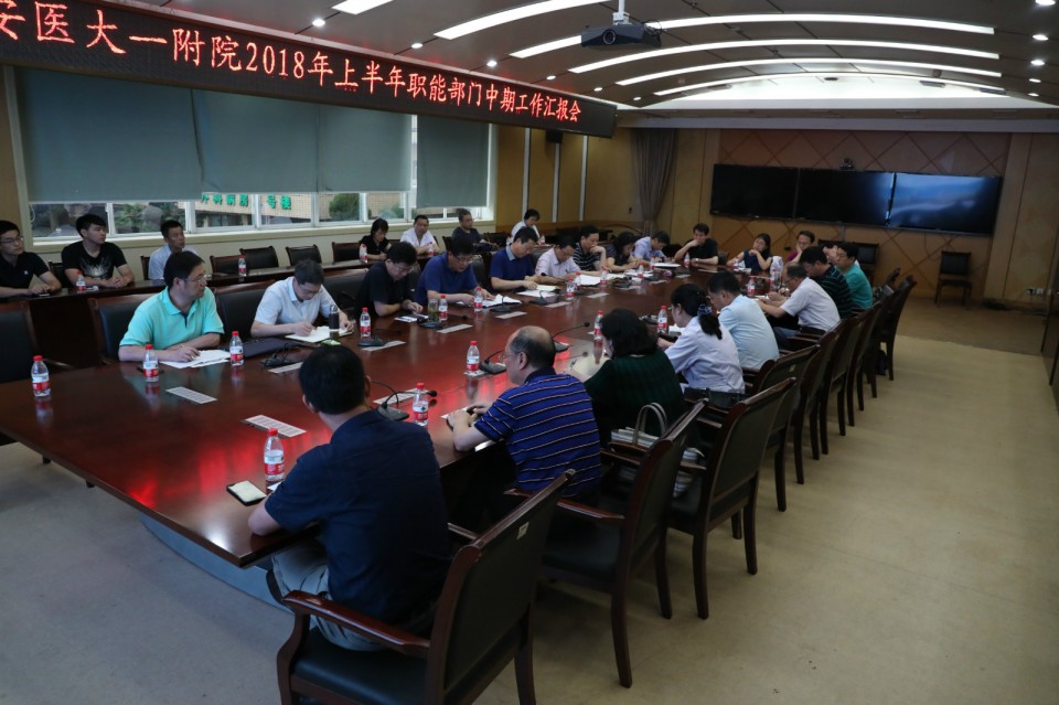7月5日,医院在干部保健中心二楼会议室召开2018年度职能处室工作汇报会,二级机构负责人以幻灯片汇报的形式,介绍了2018年上半年各项任务的完成情况,同时对下半年的工作计划进行了简要汇报。院党委书记金宗祥作重要讲话,会议由院长梁朝朝主持,全体院领导及各职能部门负责人参加了此次汇报会。