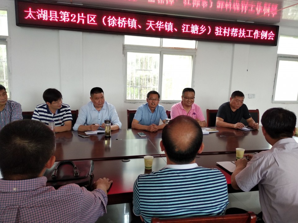 6月4日,太湖县第2片区(徐桥镇、天华镇、江塘乡)驻村帮扶工作例会在我院帮扶村——江塘乡龙山村召开。太湖县委组织部副部长潘茂仁,江塘乡党委书记王丙宇,以及来自徐桥镇、天华镇、江塘乡3个乡镇的贫困村党组织第一书记(扶贫队长)、副队长和省选派扶贫专干,乡镇组织委员,县委组织部、县扶贫办相关同志30余人参加会议。会上,龙山村党总支第一书记、扶贫工作队队长黄尧作为“出列村”代表,介绍了村情村貌和村集体经济发展情况,详细汇报了医院2017年以来下大力气对龙山村及太湖县开展帮扶以来采取的措施和取得的成效,并就交流了龙山村“党建引领扶贫和产业发展”的工作经验,还现场回答了其他扶贫队长的提问。潘茂仁充分肯定了一附院帮扶工作队驻村以来所取得的成绩,对继续做好党建引领扶贫工作提出了新的具体要求。