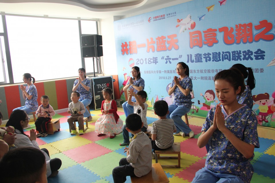 “六一”前夕,一场别开生面的联欢会在高新院区上演,来自东航安徽分公司和安医大的志愿者们为正在小儿神经康复中心接受治疗的小朋友们送去了精彩纷呈的表演。本次活动由医院团委和东航安徽分公司团委联合主办。院党委副书记戴晓支、东航安徽分公司团委书记杨嘉玮、小儿神经康复中心主任吴德等为小朋友们送上了节日的祝福。
