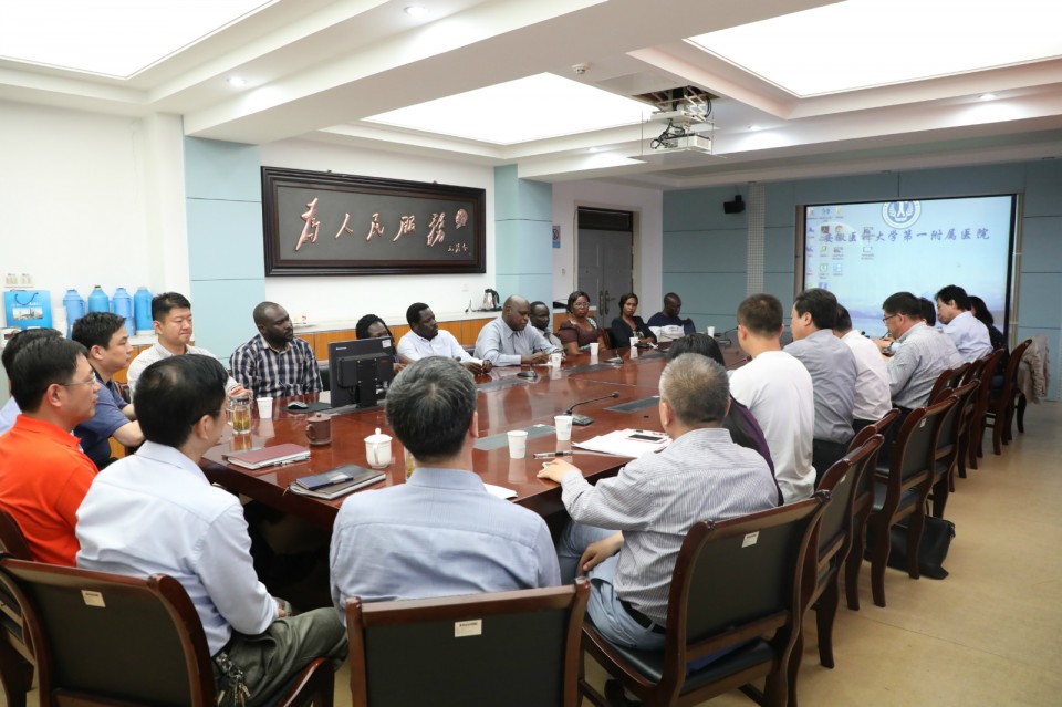 首先,院长梁朝朝对前来慰问的金维加副主任一行表示欢迎,详细介绍了对于本次研修项目,省卫计委和我院高度重视此次培训任务,在省卫计委的正确领导下医院做了大量的工作;同时指出我院一向重视援外医疗工作,围绕此次培训进行了详细全面的筹备,以帮助南苏丹进修人员取得优异的研修成果。