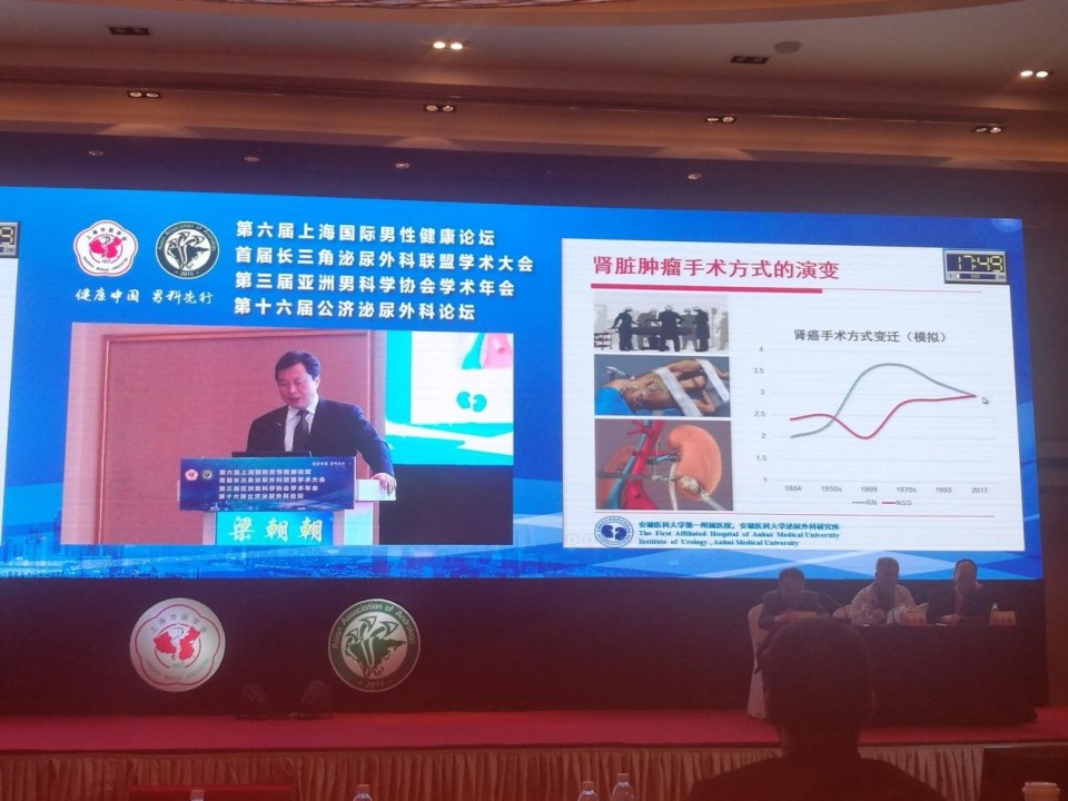 5月5日,泌尿外科梁朝朝教授参加上海市第一人民医院主办的第六届上海国际男科健康论坛并授课,梁朝朝教授做了《不同类型肾脏肿瘤NSS术应对策略》的学术报告,报告中梁朝朝教授就机器人腹腔镜手术系统在外生型肿瘤、内生型肿瘤、孤立肾肿瘤、双肾肿瘤、分支动脉阻断、肾段动脉阻断、血管成像体系等方面在肾部分切除中的运用做了系统全面的介绍;随后梁朝朝教授主编的《前列腺疾病解读》举行了首发仪式,最后进行了《慢性前列腺炎诊治专家共识》的解读。