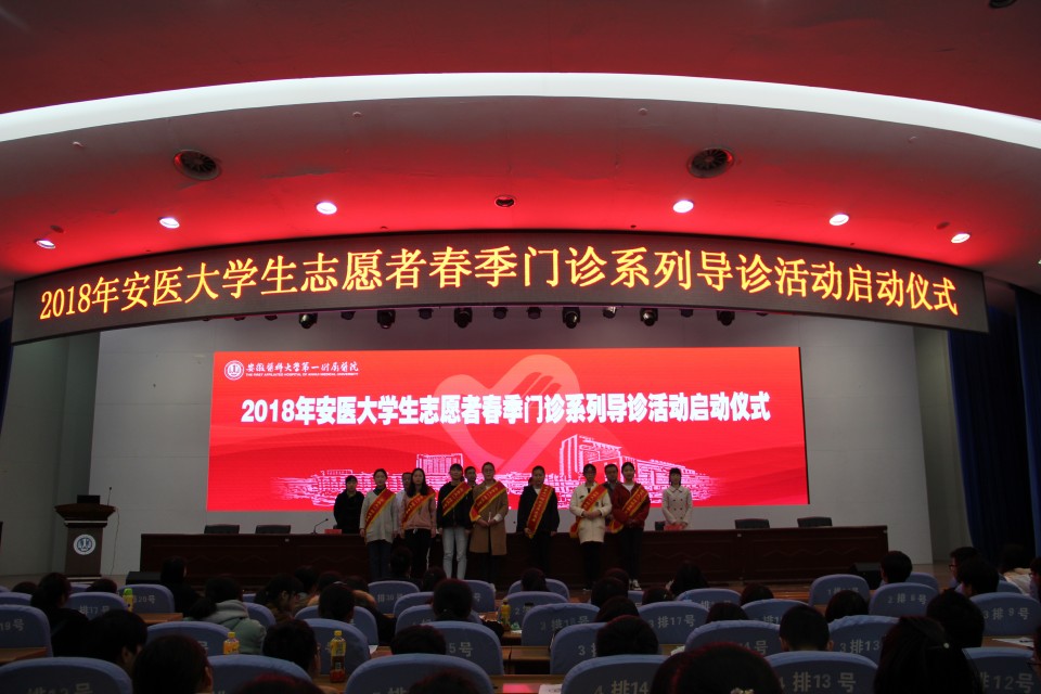 3月17日,医院举行2018年公共卫生学院志愿者春季绩溪路门诊导诊启动仪式。院党委副书记戴晓支、安医大公卫学院党委副书记何婷婷出席并讲话。门诊部主任李维荣、院团委书记黄尧、公卫学院团委书记王晶晶及近300名学生志愿者参加会议。