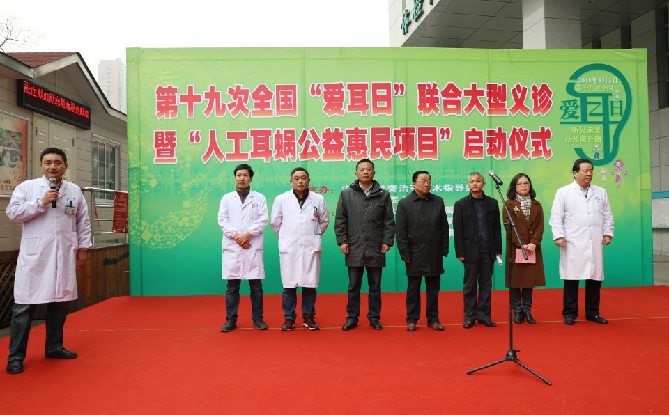 2018年3月3日是全国第十九次“爱耳日”,也是第六次“国际爱耳日”, 今年的主题是“听见未来,从预防开始”。当天上午,由我院耳鼻咽喉头颈外科承办的安徽省第十九次“爱耳日”联合大型义诊活动暨“人工耳蜗公益惠民项目”启动仪式在绩溪路门诊广场举办。省卫计委医政医管处副调研员温耀斌、省残疾人联合会康复处副处长高鹰、康复中心主任刘红、省防聋治聋技术指导组组长、副院长金小干等领导出席启动仪式并讲话。