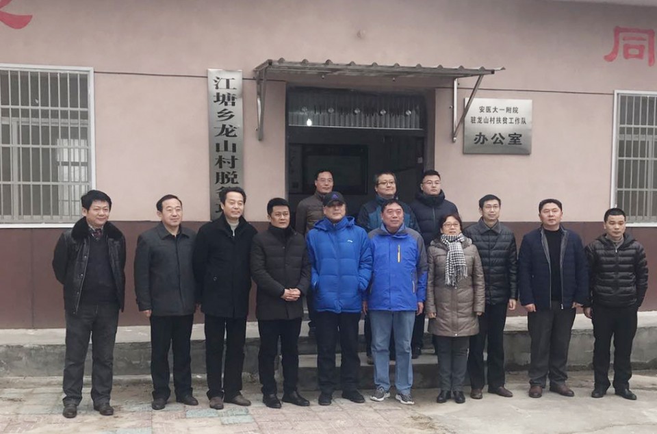 日前,全国总工会教科文卫体工会副主席陈晖、卫生体育工作部部长刘毅、教育工作部副部长张海港一行来皖,先后视察了合肥、安庆等地高校,亲切慰问了师生员工。1月18日在宜期间,全总领导在省教科文卫体工会主席凤桦的陪同下来到太湖县江塘乡,亲切看望、慰问了部分困难教师和医生。院扶贫领导组常务副组长、院党委副书记戴晓支参加慰问。太湖县副县长阮波、江塘乡党委书记王丙宇等全程陪同。每到一处,陈晖、凤桦等领导都与困难教师医生亲切交谈,了解工作生活中的困难。在龙山村,院党委副书记戴晓支与医院扶贫工作队向远道而来的领导介绍了一附院自2017年5月驻村以来在脱贫攻坚工作中所取得成绩。参观了脱贫攻坚办公室及资料档案室,深入了解扶贫工作队的日常工作、节假日值班等情况。随后,各位领导来到龙山村卫生室,看望并慰问了身患残疾仍坚持为贫困户送医送药的村医金宇敏,对他爱岗敬业、甘于奉献的精神表示敬意,对他扎根基层为民服务表示感谢。