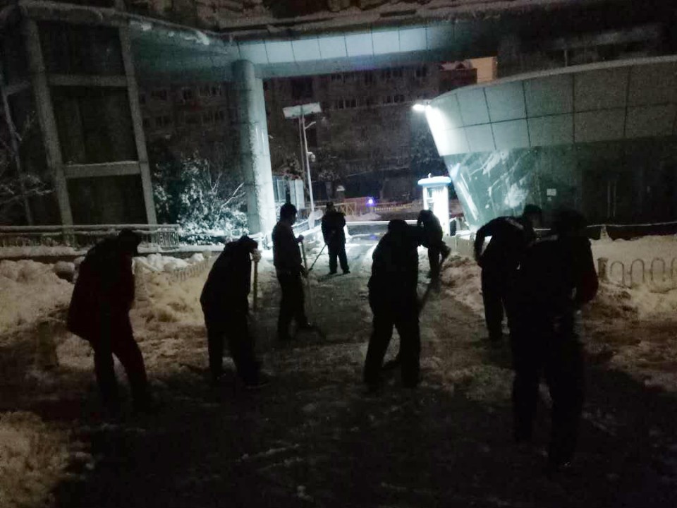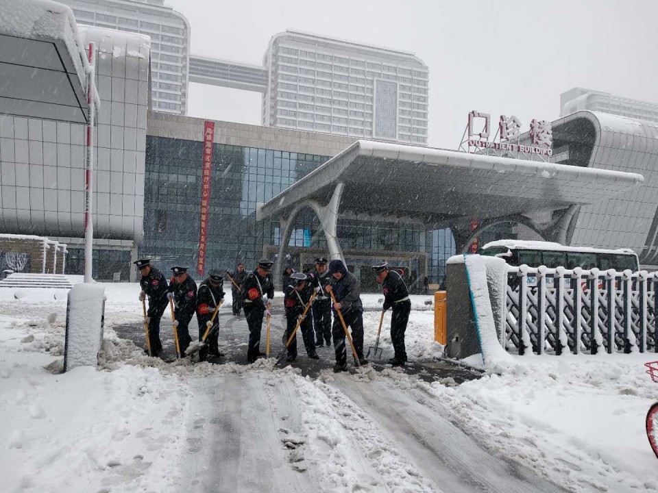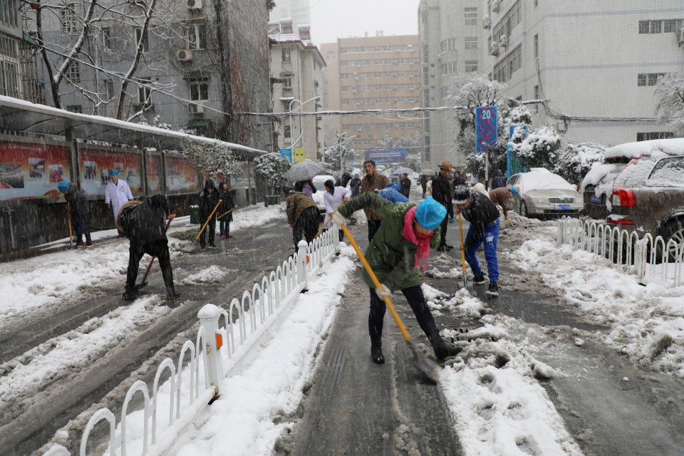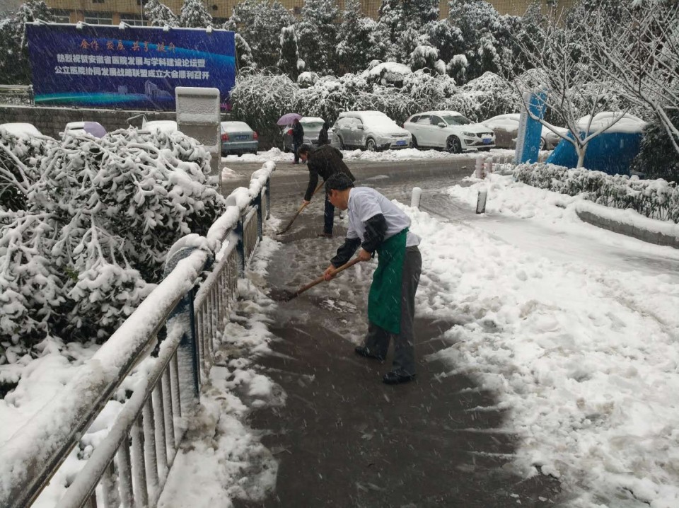 1月3日夜间,合肥市普降暴雪。为保障安全、保障医疗工作的顺利开展,4日上午,副院长周典主持召开暴雪天气应对协调会。总务处、信息中心、保卫科等相关部门负责人参加会议,会议在总务处小会议室召开。会后,各相关部门立即组织起来,动员行政工作人员、物业、保安等不间断清扫,防止夜间道路结冰;加强路面交通管理,确保道路畅通;检查清除简易房屋顶和树木积雪,防止积雪造成破坏和损失;检查水电、网络等系统,确保线路管道畅通,力争将暴雪对我院正常工作的影响程度降到最低。