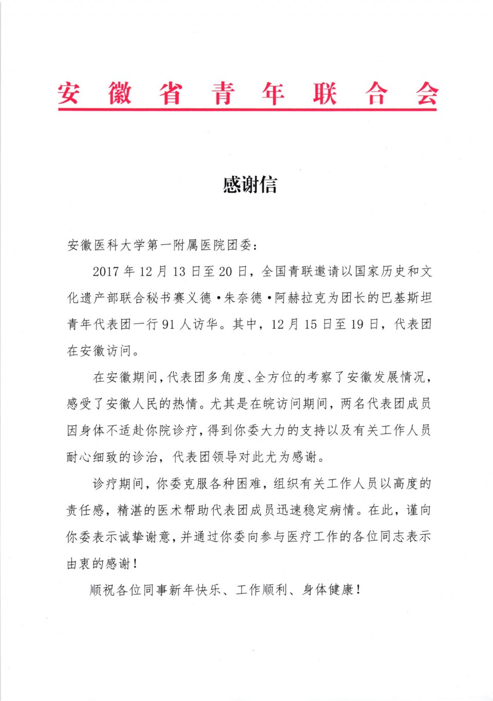 日前,安徽省青年联合会秘书处发来感谢信,感谢医院对来华交流的巴基斯坦青年代表团成员耐心细致的诊治以及对国家外交工作的支持。