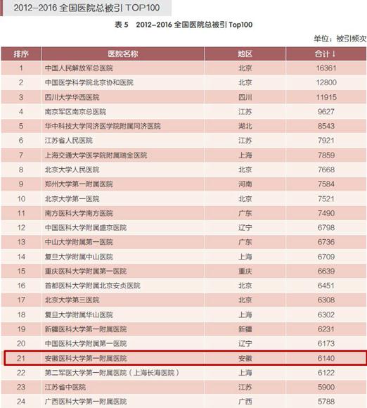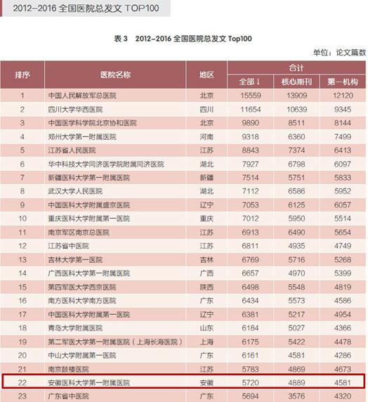 近日,中国医学科学院医学信息研究所正式对外发布《中国生物医学科技期刊论文统计(三级医院)》报告。我院近五年(2012-2016)共发表科技论文5720篇,位列全国第22名,其中核心期刊论文4889篇,以第一机构发表的论文4581篇;论文总被引6140次,位列全国第21名。无论是发表的科技论文数量还是被引总数均位居安徽省医疗机构首位。