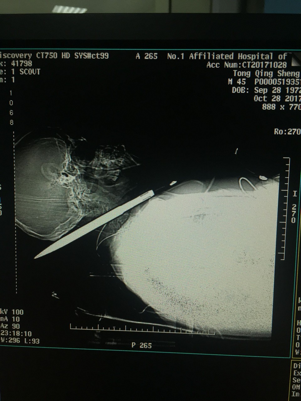 10月28日,45岁的建筑工人童某在工作时,意外从高空坠落,被地上一根竖起的电钻钻头从右颈部前侧贯穿右侧颈后近颅底处,下体和颈部鲜血淋漓,令人不忍卒睹。