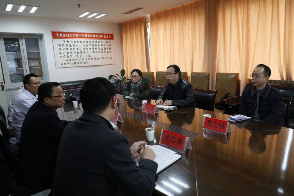 12月5日,受国家卫生计生委医政医管局委托,根据国家卫计委办公厅《关于开展2017年全国血液安全技术核查工作的通知》要求,贵州省人民医院输血科杨眉主任、贵州省骨科医院输血科夏克明主任在安徽省血液管理中心副主任范文安陪同下来我院开展血液安全技术核查工作。上午8时许,副院长金小干在输血科会议室主持会议欢迎卫计委专家一行,医务处负责人黄志勇和输血科主任卞茂红参加了会议。会议上,安徽省血液管理中心副主任范文安首先阐述了此次全国血液安全核查工作的目的和意义,并向两位专家介绍了我院概况。副院长金小干对核查组专家们来我院进行血液安全核查表示欢迎,向核查专家组简要介绍了我院临床输血管理工作,并同专家们就做好社会无偿献血、增加血液供应问题等交换了意见和看法。金小干希望专家们在此次血液安全技术核查过程中多提宝贵意见,更好地促进我院临床输血管理工作。输血科主任卞茂红随后就我院临床输血管理、临床用血情况、输血科学科建设、实验室管理、人才梯队建设和教学科研工作进行了汇报。