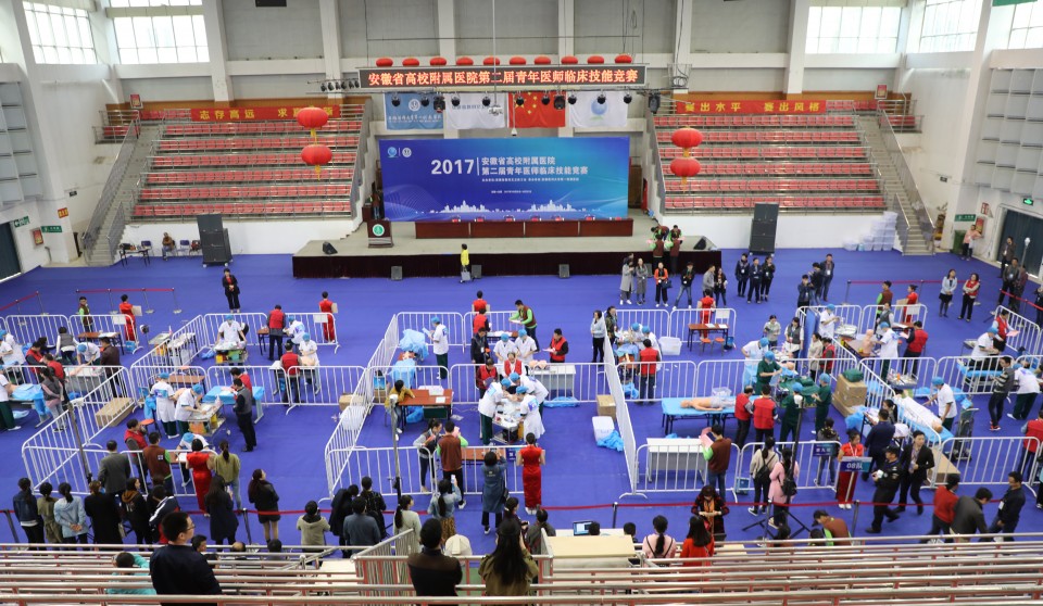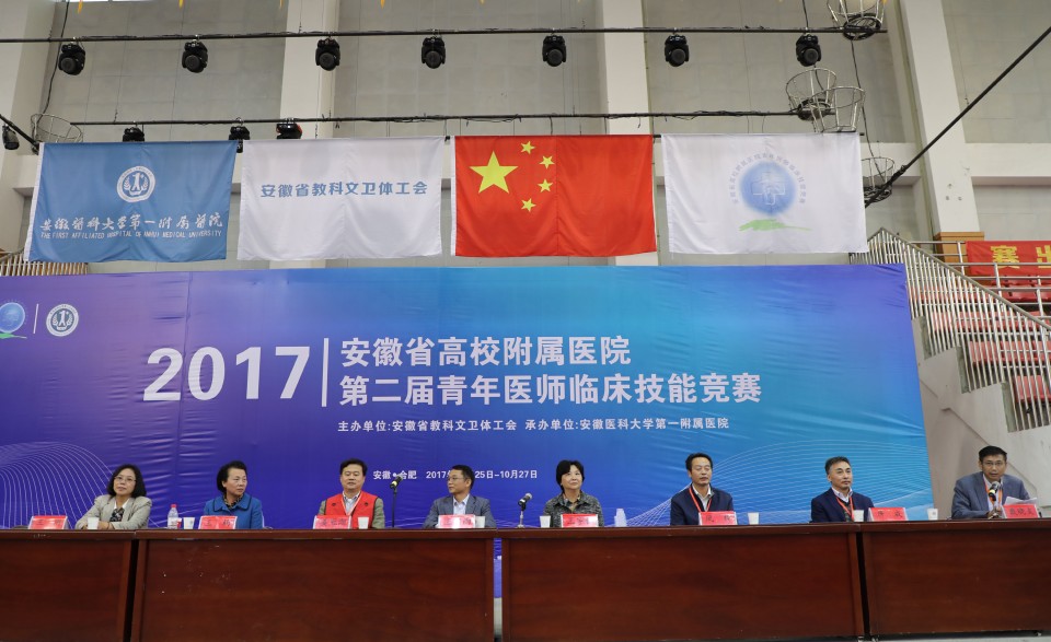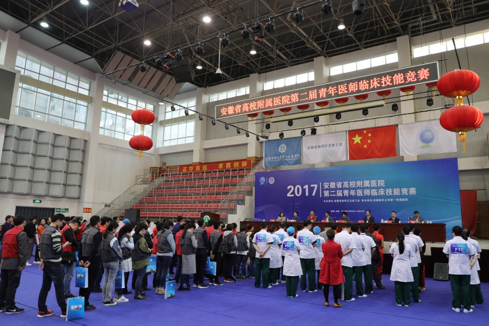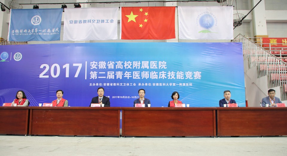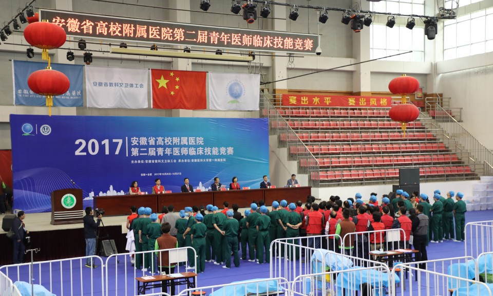 2017年10月26日,由安徽省教科文卫体工会主办,我院承办的安徽省高校附属医院第二届青年医师临床技能竞赛在安医大体育馆拉开帷幕。来自安医大一附院、安医大二附院、安医大四附院、安医大附属巢湖医院、中医一附院、中医二附院、蚌医一附院、蚌医二附院、皖医一附院、皖医二附院的10支高校附属医院代表队参加了比赛。大赛总裁判长、北京大学人民医院临床能力培训中心主任姜冠潮,省纪委驻省总工会纪检组组长、省总工会党务成员王国雨、省卫生计生委副巡视员王宇铭,大赛副裁判长、安徽省卫生计生委医政医管处处长王卉晓,安徽省教科文卫体工会主席凤桦,副主席唐成,安医大一附院院长梁朝朝,副院长王珩,党委副书记戴晓支等出席并致辞,开幕式由我院党委副书记戴晓支主持,大赛总裁判长和参赛选手代表分别进行了宣誓。