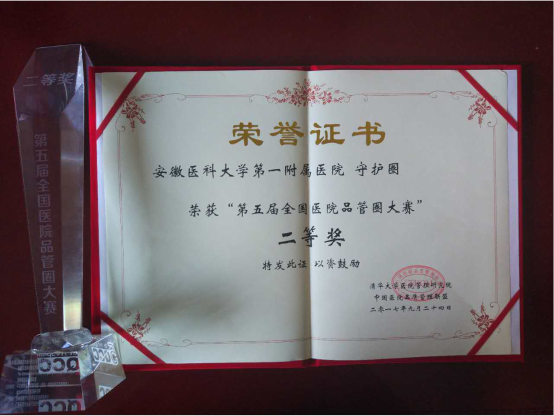 我院神经内科“守护圈”以创新模式提高脑卒中患者生活质量,降低疾病复发为目的,取得良好的社会及经济效益。它作为本届课题研究型品管圈的参赛代表,参与的护理团队凭借沉稳大方的台风、严谨务实的态度在决赛舞台上大展风采,获得现场评委专家和观众的好评,经过激烈的角逐,脱颖而出,最终“守护圈”获课题研究型品管圈专场二等奖;安徽医科大学第一附属医院荣获2017年度“品管圈积极推动先进集体”;胡少华副主任、药剂科谈超被评为“百名优秀个人”。