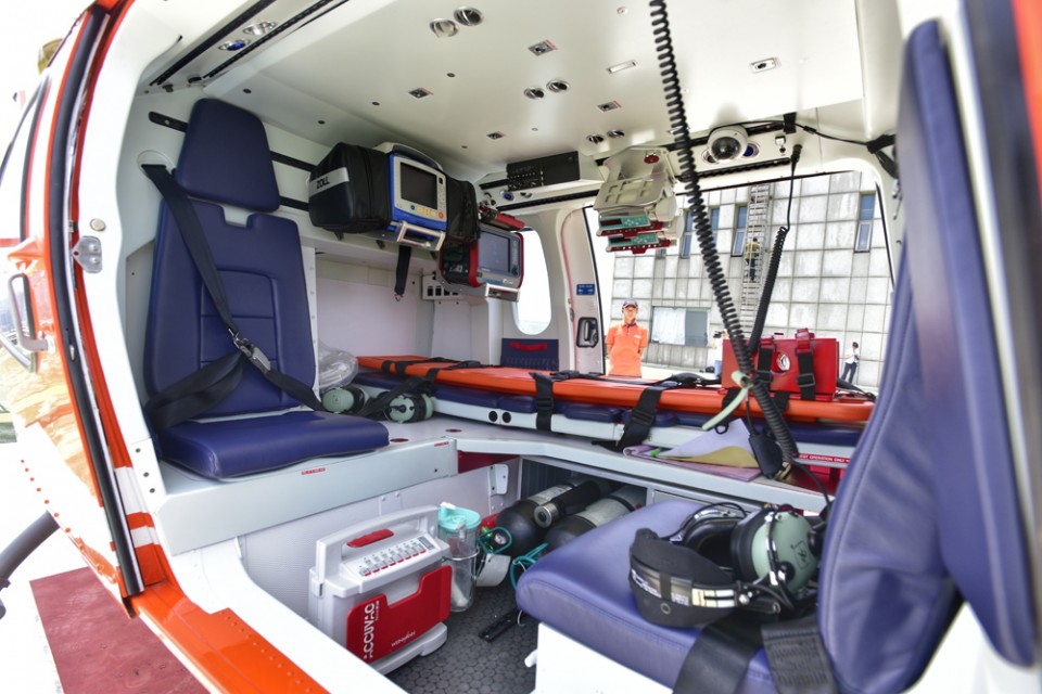 现场这架橘红色直升机,是上海金汇通用航空股份有限公司的医疗构型直升机,里面搭载了专业航空医疗设备,包括呼吸机、除颤监护仪、注射泵、吸引器和医用氧气等,整体就是一个小型ICU,能够在救援飞行的路途上对患者进行及时抢救,最大限度的挽救患者生命。