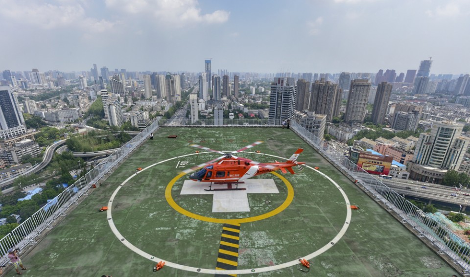 除了外科1号楼楼顶的停机坪外,我院高新院区地面停机坪也基本建设完成,月底前也将投入使用。届时高新院区停机坪将常备直升机,除了承担紧急医疗救援外,还开展全省的空中医疗救援的专业培训。