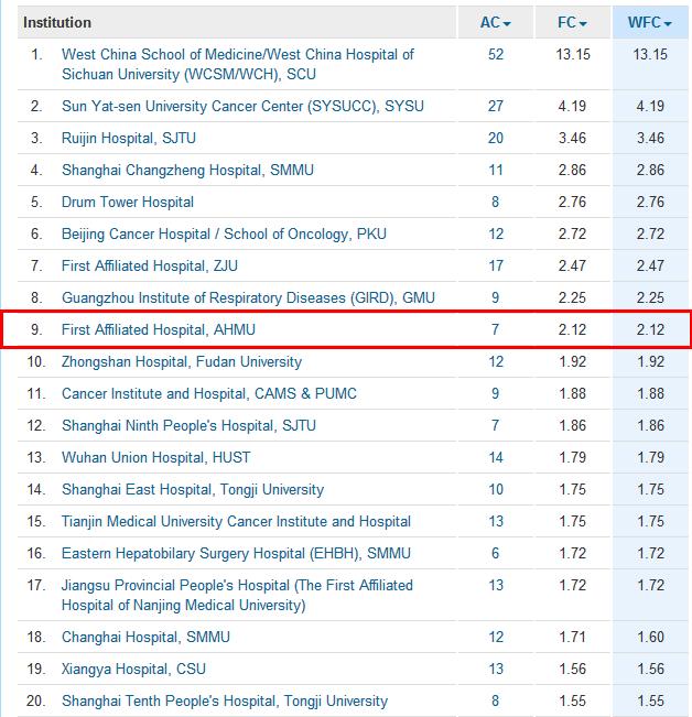 近日,Nature出版集团发布了2017年度自然指数排行榜(Nature Index 2017 Tables), 安医大一附院以7篇高水平的学术论文(AC)、2.12的分数计数(FC)荣膺全国医疗机构第9位,较2016年的第25位上升了16位,同时也是安徽省内唯一一家入围全国百强的医疗机构。