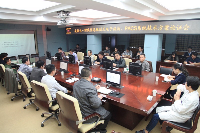 10月23日下午,我院在行政楼五楼第二会议室召开信息规划及电子病历、PACS系统技术方案论证会。会议由副院长周典主持,省卫计委信息中心主任张为民、医院信息中心主任黄枫、省立医院、省中医院、芜湖弋矶山医院、蚌医一附院、合肥市三院、芜湖市二院信息中心负责人、我院信息中心相关科室负责人和工作人员参加会议。