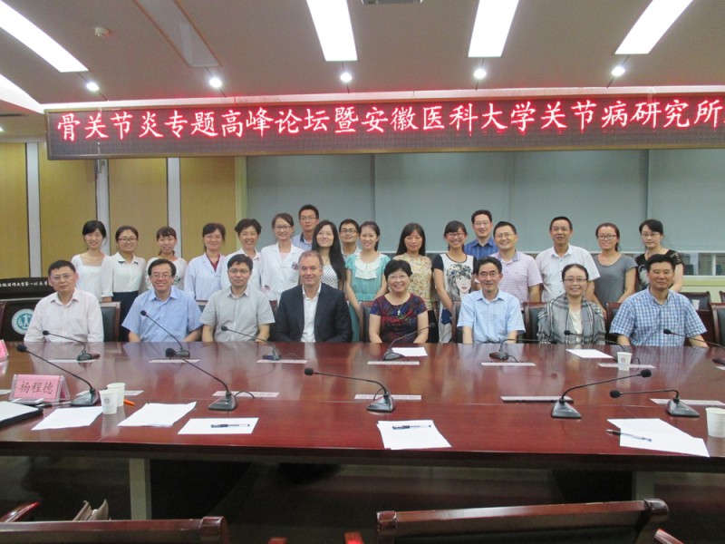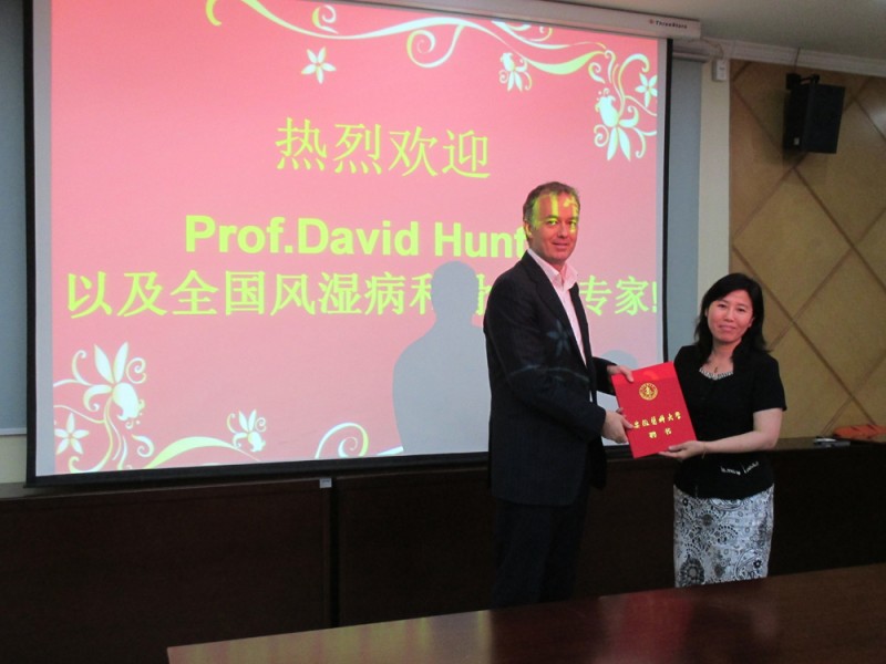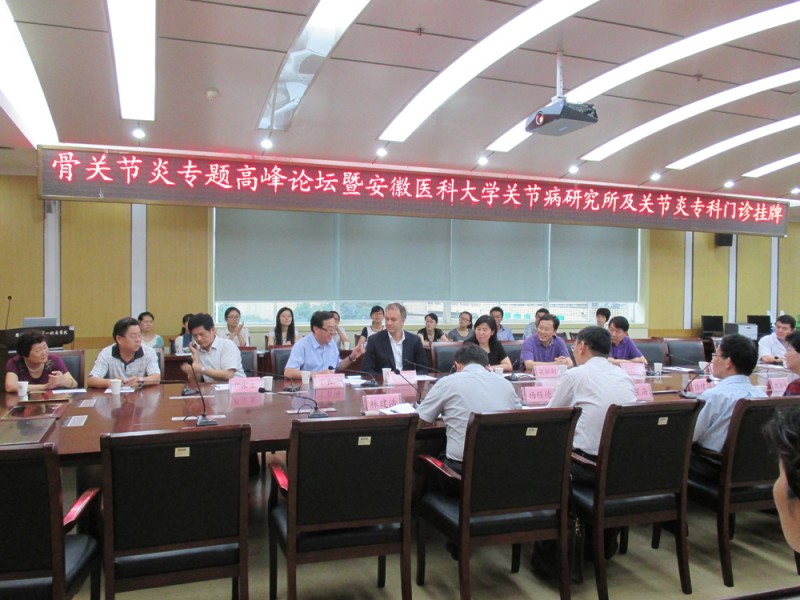 2014年7月4日下午由安徽医科大学第一附属医院风湿免疫科举办的“骨关节炎专题高峰论坛”在医院干部病房2楼会议厅顺利召开。安徽医科大学校长曹云霞教授、安徽医科大学第一附院党委书记梁朝朝教授、副院长费广鹤教授、副院长尹宗生教授和门诊部李维荣主任出席并参加了会议,曹校长对David Hunter教授及来自国内的专家教授表示热烈欢迎,并向David Hunter教授颁发了安徽医科大学荣誉教授的聘书,会议同时进行了“安徽医科大学关节炎研究所”及“关节炎专科门诊”授牌仪式。会上曹校长和梁书记分别介绍了安医大和一附院的情况,并希望发挥与两位海外教授合作优势,将我院关节炎研究带向一个新的高度,成为医院的特色专科,并逐渐成为国内外该研究领域的领先学科。风湿科主任徐建华教授主持了会议议程,并随后进行了学术交流:澳大利亚悉尼大学骨和关节研究所所长、皇家北岸医院风湿科主任David Hunter教授做了“骨关节炎发病机制及新的治疗理念”,我院关节炎研究所所长、风湿免疫科特聘海外教授丁长海教授做了“重视骨关节炎在中国的研究”,北京大学人民医院骨关节科林剑浩教授就中国骨关节炎的研究现状和他自己的研究进行了专题汇报,风湿免疫科徐胜前副教授进行了“2012年美国风湿病学院(ACR)、2013年美国骨科医师协会(AAOS)及2014年国际骨关节炎研究协会(OARSI) 关于骨关节炎治疗指南”的专题讲座,会议还邀请了上海仁济医院风湿科杨程德教授、上海长海医院风湿科韩星海教授、中国科技大学生命科学院免疫所魏海明教授、二附院血液风湿科翟志敏教授及安徽省内部分风湿病和骨科等50余名专家对骨关节炎的发病机制、流行病学特征、临床诊断和治疗等科研和临床问题进行了深入的学术探讨;并强调今后加强多学科合作研究的必要性。(风湿免疫科)