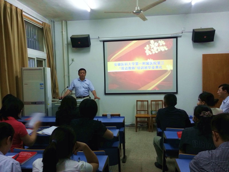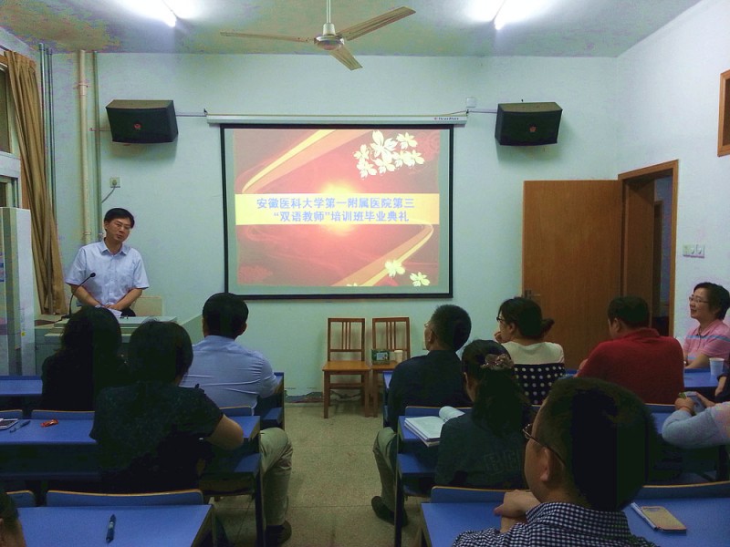 5月22日,我院第三届双语教师培训班毕业典礼在临床教学科研楼1楼多媒体教室举行。医院教育处副处长陈旭林、刘虹和大学公共基础学院院长董光峰、外语系主任蔡郁等领导和授课老师出席典礼。我院各临床教研室近30名培训班学员参加了毕业典礼,毕业典礼由教育处副处长陈旭林主持。大学公共基础学院院长董光峰首先发表讲话,他指出本届培训班历时4个月,大学公共基础学院和一附院教育处高度重视.。培训中,学员们学习努力、学习氛围浓厚,授课老师敬业,教学方法得当。通过培训班的学习,每位学员的专业英语水平和授课技巧均得到了不同程度的提高。学员代表呼吸科的王苒博士代表全体培训班成员感谢大学和医院给予这次难得的英语培训机会,表示会继续努力,为医院的双语教学增砖添瓦。