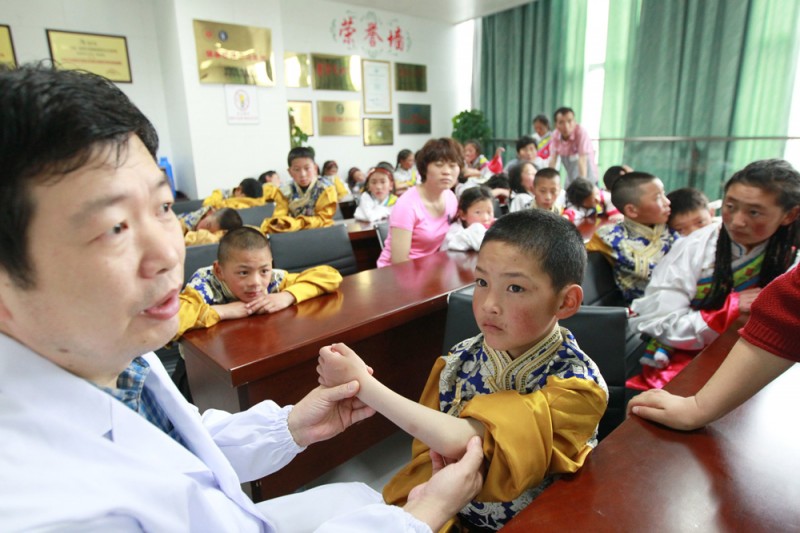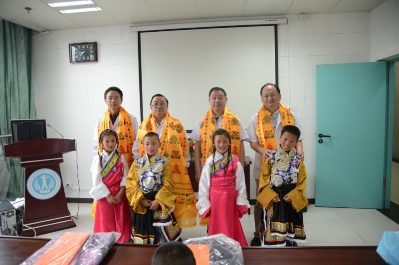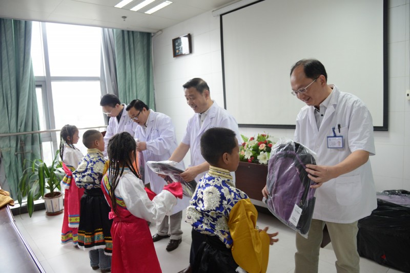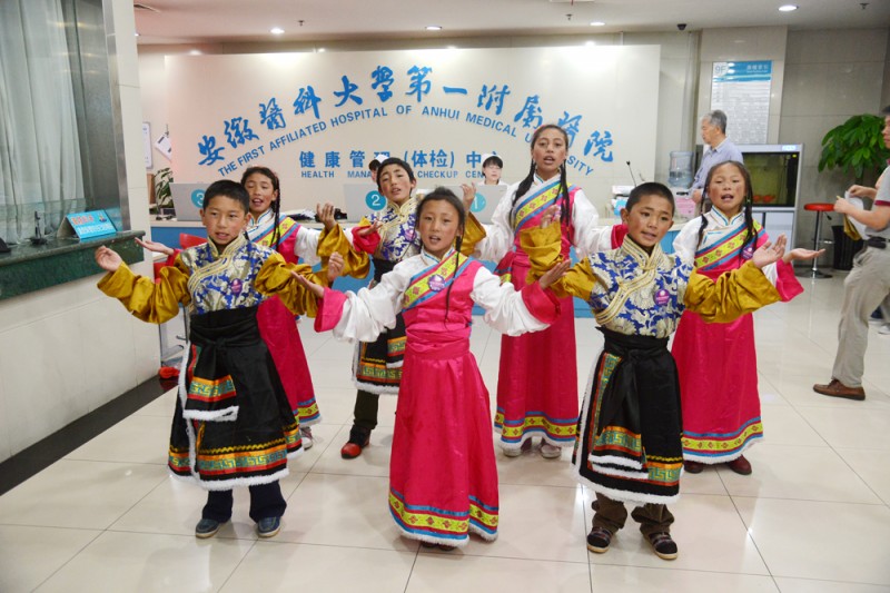 5月19日上午,安医大一附院体检中心迎来了28名身着鲜艳民族服装的藏族小朋友,他们来自青海玉树州曲麻莱县的麻多、麻秀、曲麻河、叶格四所乡村小学,到我院进行血常规、B超、心电图、胸片等常规身体检查。副院长金小干观看了孩子们的歌舞表演,代表医院赠送给孩子们新书包,并祝他们身体健康,学习进步;藏族小朋友们献上了金色的哈达表示感谢。