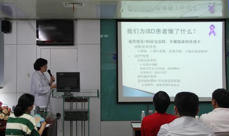 胡乃中教授、韩玮副主任医师和胡静主治医师等专家以深入浅出、图文并茂的形式介绍了炎症性肠病的防治、用药选择、生活保健知识等,现场不断响起掌声,受教患者和家属们对活动表示一致好评。现场有两位病友分享了他们战胜疾病,回归社会的催人泪下的亲身经历,令人动容。