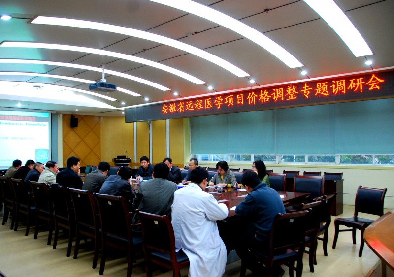 3月19日,省卫生厅医政与医管处处长费勤福、省物价局农医处处长洪凯等一行来我院就安徽省远程会诊项目收费标准调整事宜进行专题调研,副院长鲁超主持会议。院党委书记梁朝朝、远程医学中心颜雨春、院办、计财、经管、医务、信息中心等相关部门同志参加会议;省立医院、蚌医一附院,庐江、绩溪和寿县人民医院相关工作人员参加会议。