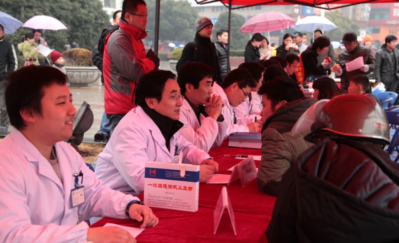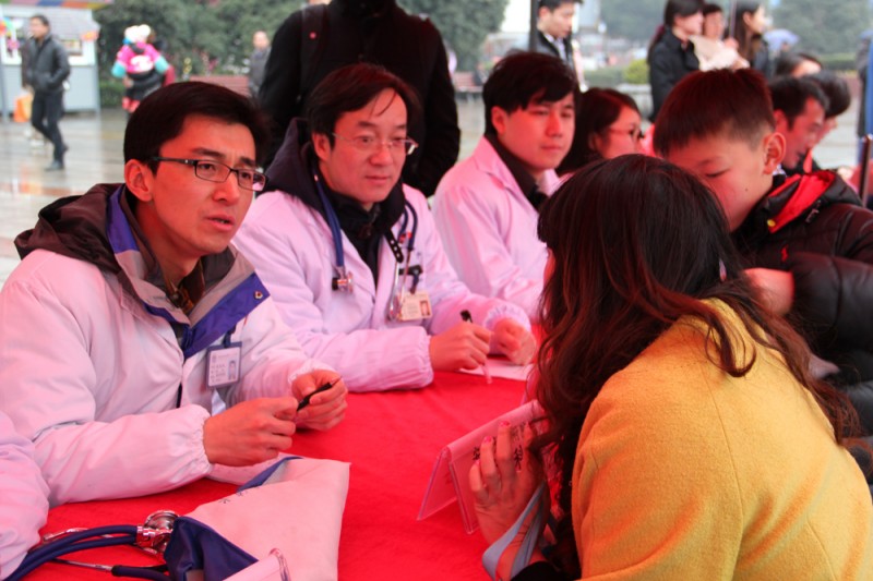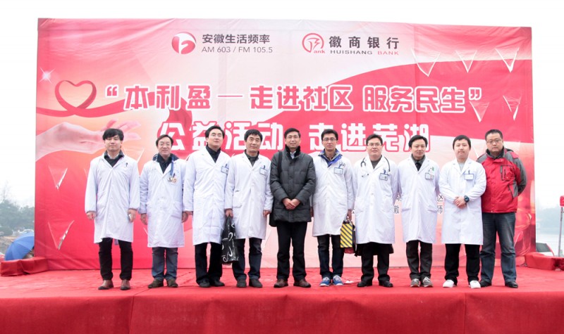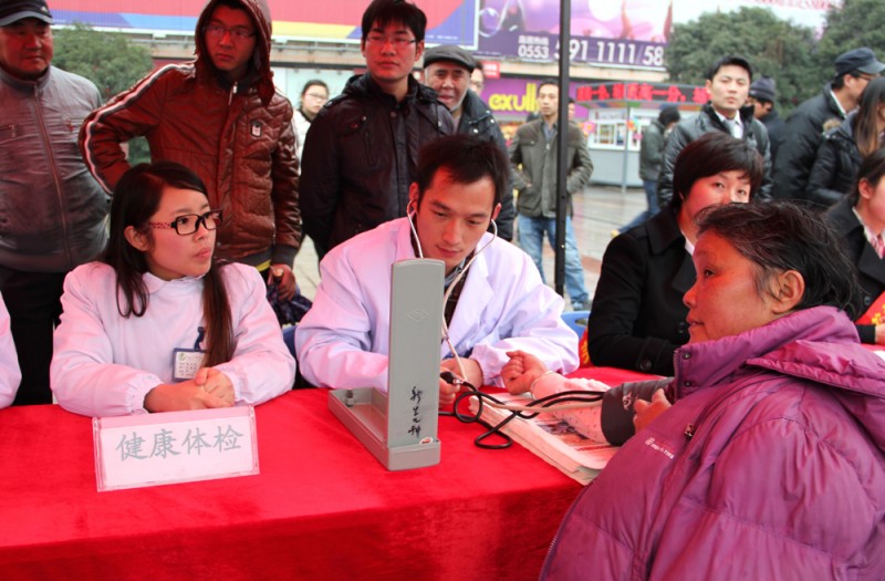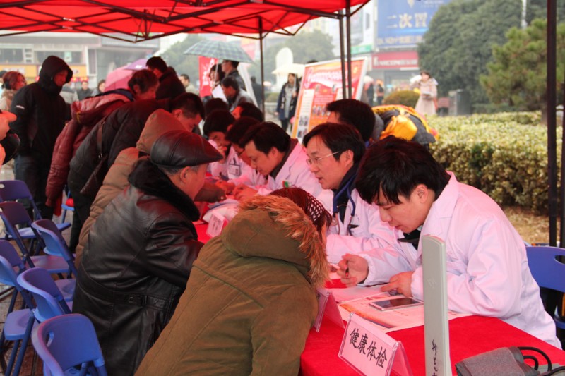 1月11日下午,我院与安徽生活广播联合举办的2014“走进社区服务民生”大型公益活动来到了芜湖步行街。由院团委、宣传部组织的来自儿科、普外科、眼科、骨科、心血管内科、内分泌科、呼吸内科的专家及青年卫生志愿者,为当地市民带来了义诊咨询、健康体检等服务。院党委副书记戴晓支、团委书记黄尧带队参加了此次义诊,团委委员梁佳宁、张巧云也在现场进行健康教育等活动。