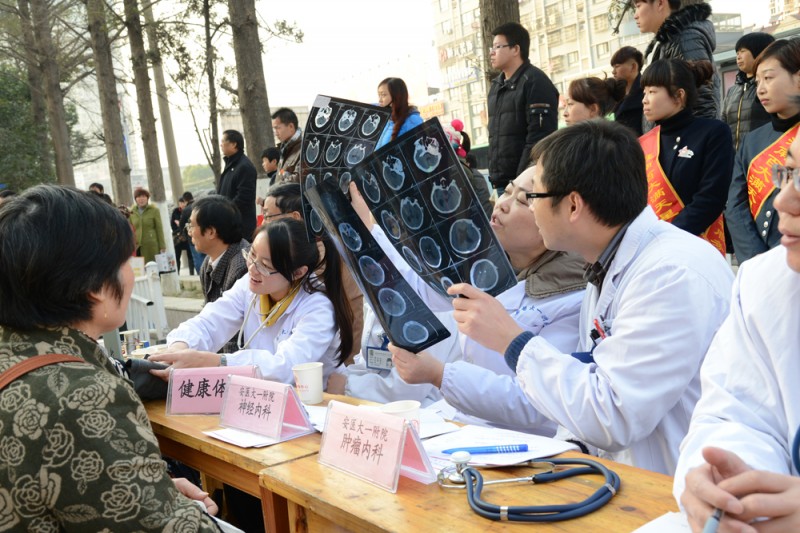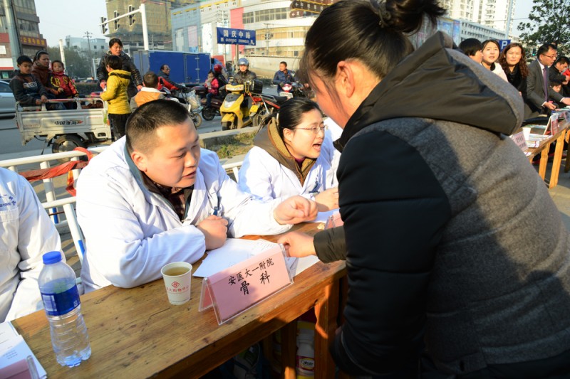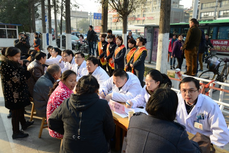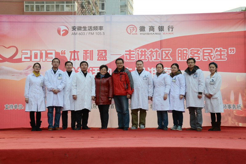 12月1日下午,我院与安徽广播电视台生活广播联合举办的2013“走进社区服务民生”大型公益活动来到了淮南,在淮南百大门前广场火热举行。由院团委、宣传部组织的来自心血管内科、神经内科、普外科、消化内科、肿瘤内科、内分泌科、骨科的专家及青年卫生志愿者为当地市民带来了义诊咨询、健康体检等服务。院团委书记黄尧参加了此次义诊,团委委员梁佳宁、张巧云、王珍也亲身参加了为市民测量血压、健康教育活动。