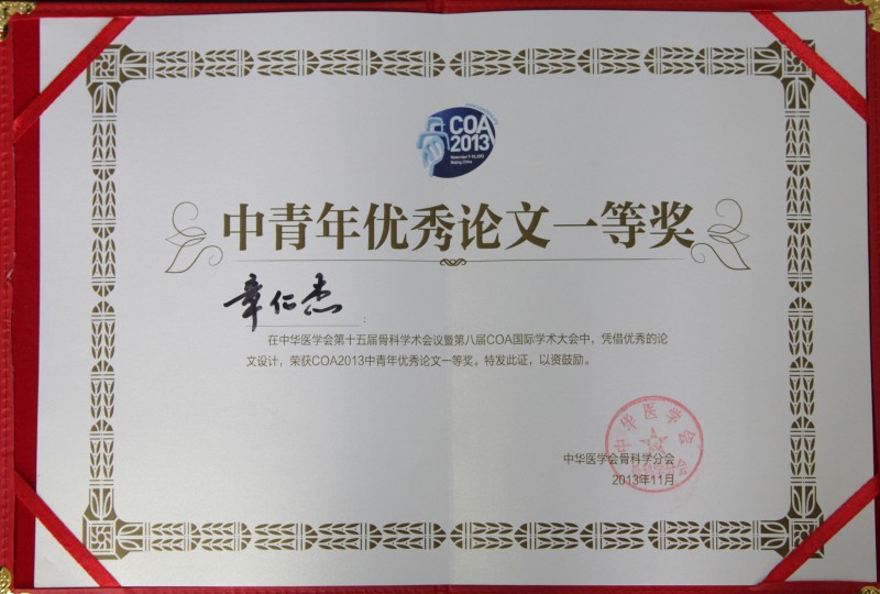 11月7日至10日,由中华医学会、中华医学会骨科学分会主办,香港骨科学院、香港骨科学会协办的2013年中华医学会第十五届骨科学术会议暨第八届国际COA学术大会在北京举行。学术大会的重要日程之一就是评选“2013中华骨科中青年医师优秀论文奖”,设立脊柱、关节、创伤和基础4组,每组从投稿中选出40篇参加现场演讲评比,分别评出一等奖1名、二等奖2名、三等奖3名。