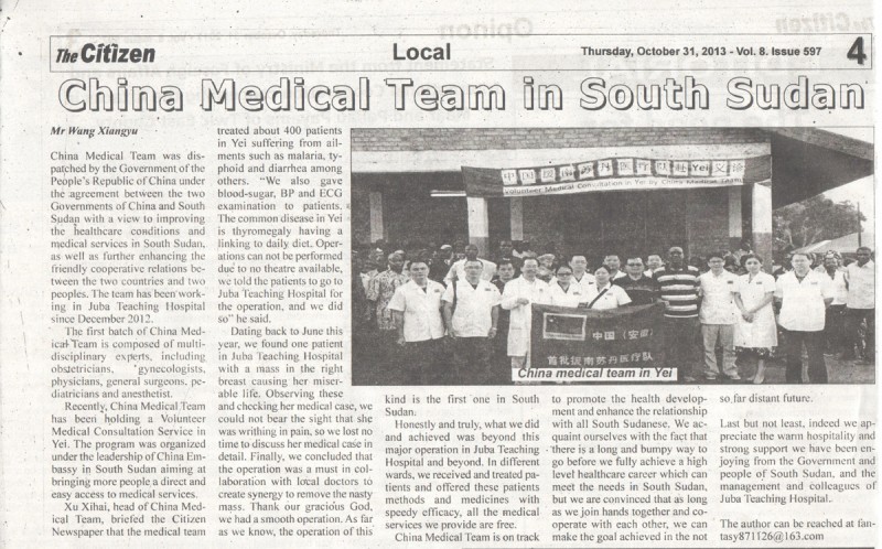 10月31日,当地最大的英文报纸Citizen (公民报)以大半个版面,全面介绍了中国(首批)援南苏丹医疗队,详细报道了中国医疗队在南苏丹的工作情况,并且举例说明中国医疗队克服种种困难,给南苏丹人民提供医疗服务。报道赞扬称:“中国援南苏丹医疗队是一支传播友谊,传播医术的值得信赖的医疗队,全心全意为南苏丹卫生事业做着贡献”。