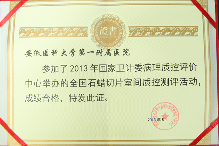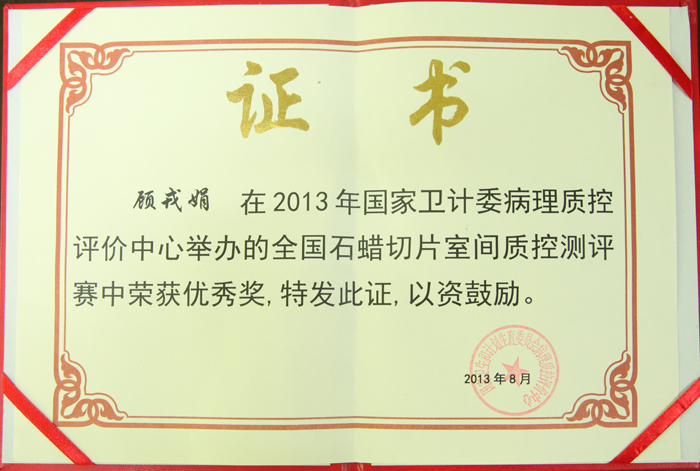 近日,由国家卫生计生委病理质控评价中心举办的全国病理技术大赛在山西省太原市落下帷幕。我院病理科顾戎娟作为安徽省第一名资格参加比赛,与来自全国各省、自治州、直辖市的参赛选手激烈角逐,获得优秀奖。同时,我院病理科还获得了由国家卫生计生委颁发的全国石蜡切片室间质控测评合格奖。