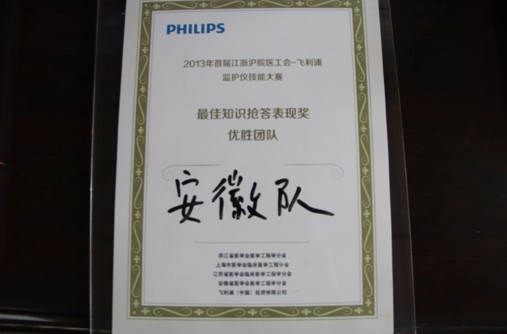8月16日至17日,我院医学工程部主任张晓斌率领由我院、安徽省立医院、安徽医科大学第二附属医院、蚌埠医学院第一附属医院和皖南医学院弋矶山医院组成的安徽队参加由浙江省医学会医学工程分会组织的2013年首届江浙沪皖监护仪技能大赛,并荣获最佳知识抢答表现奖这一重量级奖项。