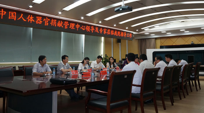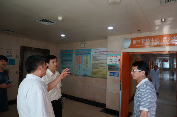8月6日下午2:00,中国人体器官捐献管理中心邹庆波处长一行、省红十字会救灾赈济部姚卫东部长、事业拓展部汤长荣主任和省卫生厅医政医管处谢琤主任来到我院检查指导器官移植工作。副院长金小干、医务处处长李元海、副处长黄志勇、器官移植中心主任耿小平教授和赵红川副主任医师、泌尿外科廖贵益副主任医师陪同检查。