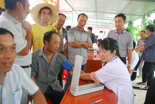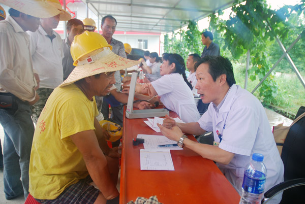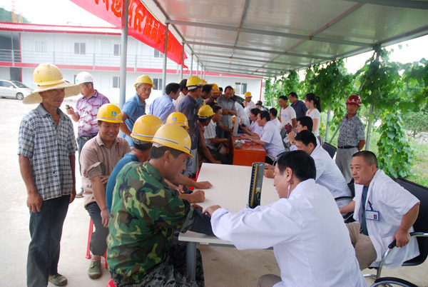 为深入贯彻医院党的群众路线教育实践活动,7月20日下午,由医院党委委员、党委工作部部长高长林、外科党总支书记余宏铸带队,组织外科党总支党员专家冒雨前往高新分院建设现场开展慰问义诊活动,并为建设一线工作的工友们免费发放防暑慰问品。义诊结束后,党员专家们在高新分院党支部书记等陪同下前往高新分院建设现场参观。