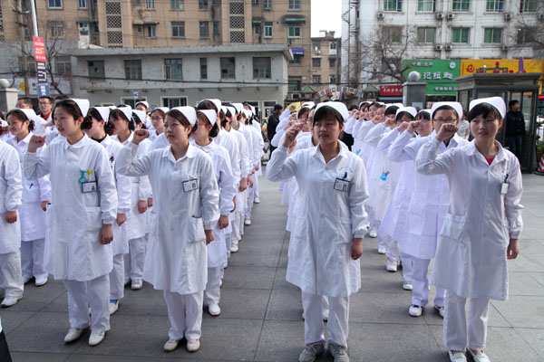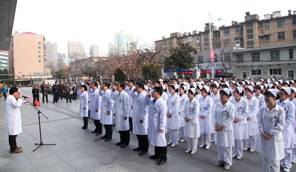 3月27日下午,医院在绩溪路门诊部广场举行医生誓言、护士集体宣誓活动。该活动系2013年医德教育月系列活动之一。院领导梁朝朝、余永强、刘全礼、王润玲、鲁超、费广鹤、李家斌、各职能处室负责人、党总支书记、2012年参加工作的医生、护士参加了宣誓仪式。宣誓仪式由院长余永强主持。