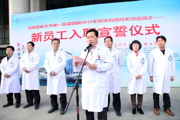党委书记梁朝朝在仪式上发表讲话,他指出,新入院的医生、护士、医技和行政后勤管理人员,举行入职宣誓活动,这是我院“医德教育月”的一项重要内容,其目的在于让大家重温一次誓言,重新感受医院工作的神圣和高尚,进一步强化服务意识,改善服务态度,不断提高医疗质量和服务水平,努力保证医疗安全,真正做到让老百姓放心看病,让老百姓看病放心。