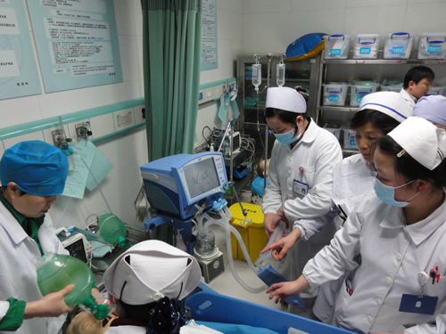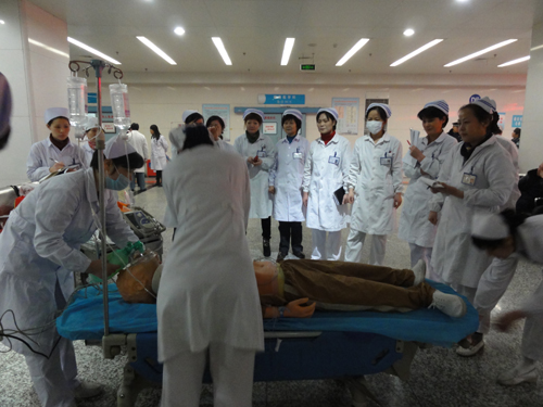 演练模拟了1日下午四点半,我院急诊护士接到120电话报告,因大批车祸伤将有10余名病员送入我院。护理部接到急诊科护士长电话后,立即通知各相关科室护士长及护理紧急人力资源库成员立即前往急诊科一楼大厅,并准备备用病床及相关物品,10分钟内一切准备就绪,等待伤者到达。伤者到达后经过分诊被推入相应区域进行抢救,最后送至骨科和普外科病房。至此,演练按计划顺利完成。此次演练组织周密,场面逼真,达到了演练目的和预期效果。
