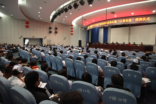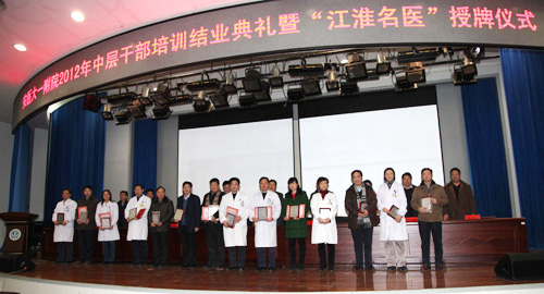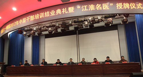 1月4日下午,医院在会议中心举行2012年中层干部培训班结业典礼暨“江淮名医”授牌仪式。校党委书记李俊出席会议,院党委书记梁朝朝发表重要讲话,院党委副书记刘全礼宣读省委组织部、省卫生厅、省人力资源和社会保障厅和省财政厅《关于授予安徽省“第一届江淮名医“称号的决定》文件,院党政领导班子成员、党总支书记、党支部书记、各党政职能部门副科以上干部,临床、医技各科室及教研室正、副主任,病区主任,研究所正、副所长、各科室及病区护士长和15名获评“江淮名医”的专家参加了会议,会议由院长余永强主持。