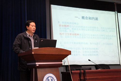 梁朝朝教授从卫生职业精神的概念与内涵、背景与溯源、现状与反思、探索与展望等四个方面,并结合我院的具体实践和自己多年的从医经验,引经据典,详实地阐述了医疗卫生职业精神和职业道德,引导研究生共同思考医疗卫生工作者正确的价值追求,以及在新形式下如何弘扬卫生职业精神,构建和谐的医患关系,更好地承担社会责任和义务。