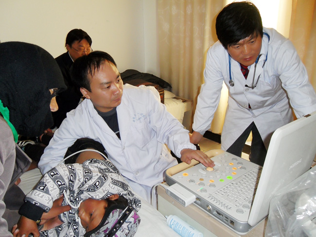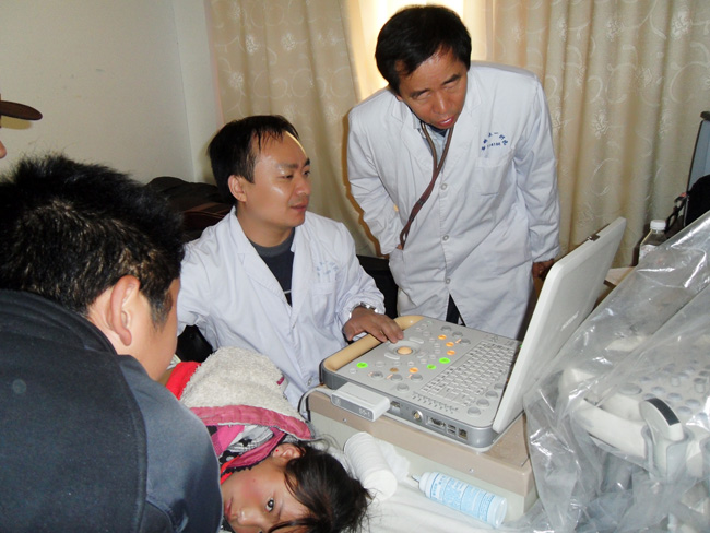 专家组下午2点开始工作,首先对17位经当地医生筛查过的疑似患儿进行了确诊。接着分别对当地幼儿园、一年级、二年级、三年级500多儿童进行筛查。经过4个小时不停筛查,第一天共筛查了113名儿童,经过专家组对听诊和彩超结果的讨论分析,确诊了1名儿童为先天性心脏病患儿,其余400名儿童将于9月8日行筛查确诊。